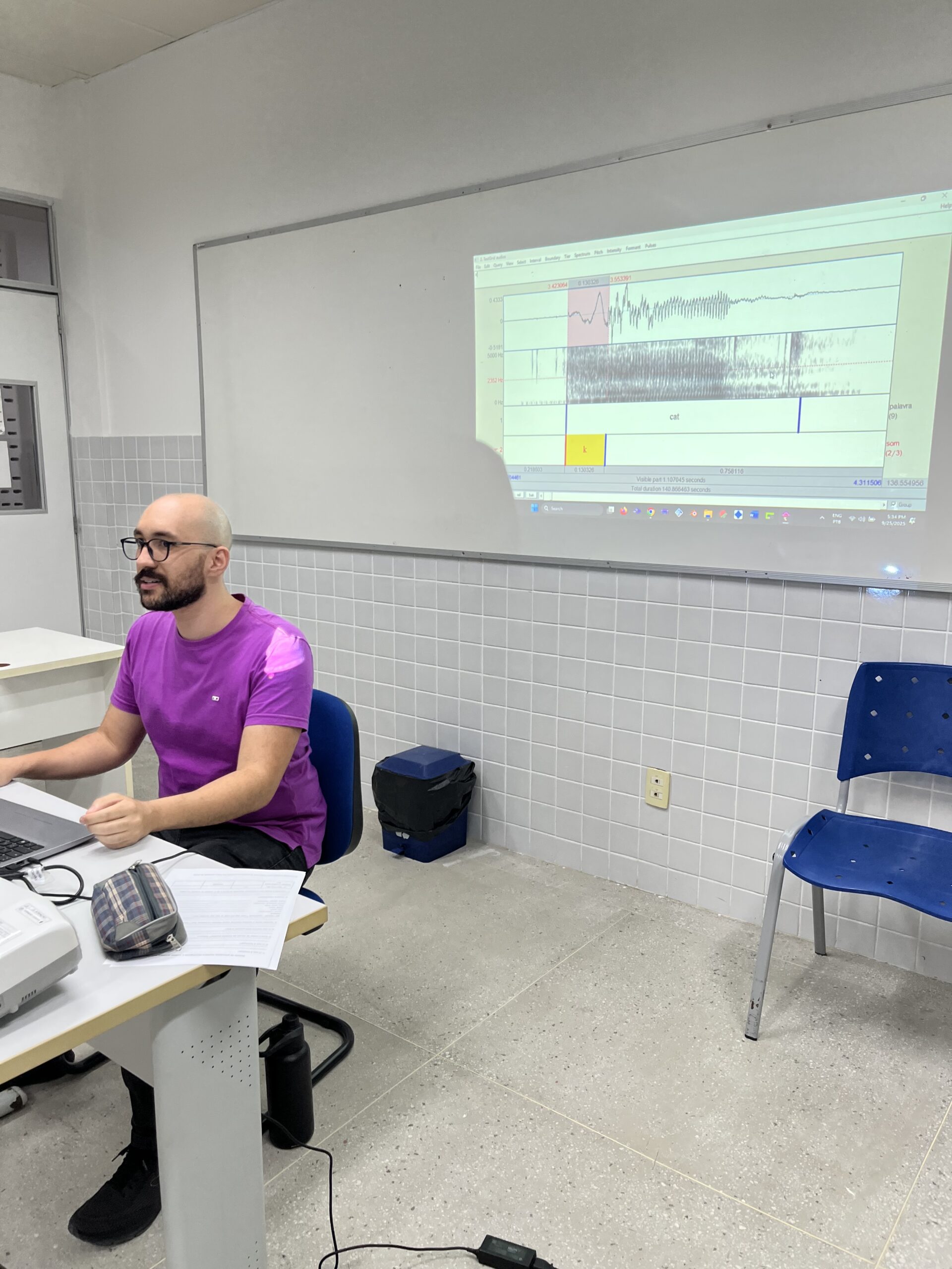 Os professores Anderson Romário e Katiene Rozy deram início a um curso de formação sobre a Fonética Acústica envolvendo a análise de gravações de fala voltadas para as características de pronúncia da língua inglesa. O objetivo da ação de extensão é estudar características de pronúncia que dificultam a aprendizagem do inglês por estudantes brasileiros através de atividades com análise acústica.